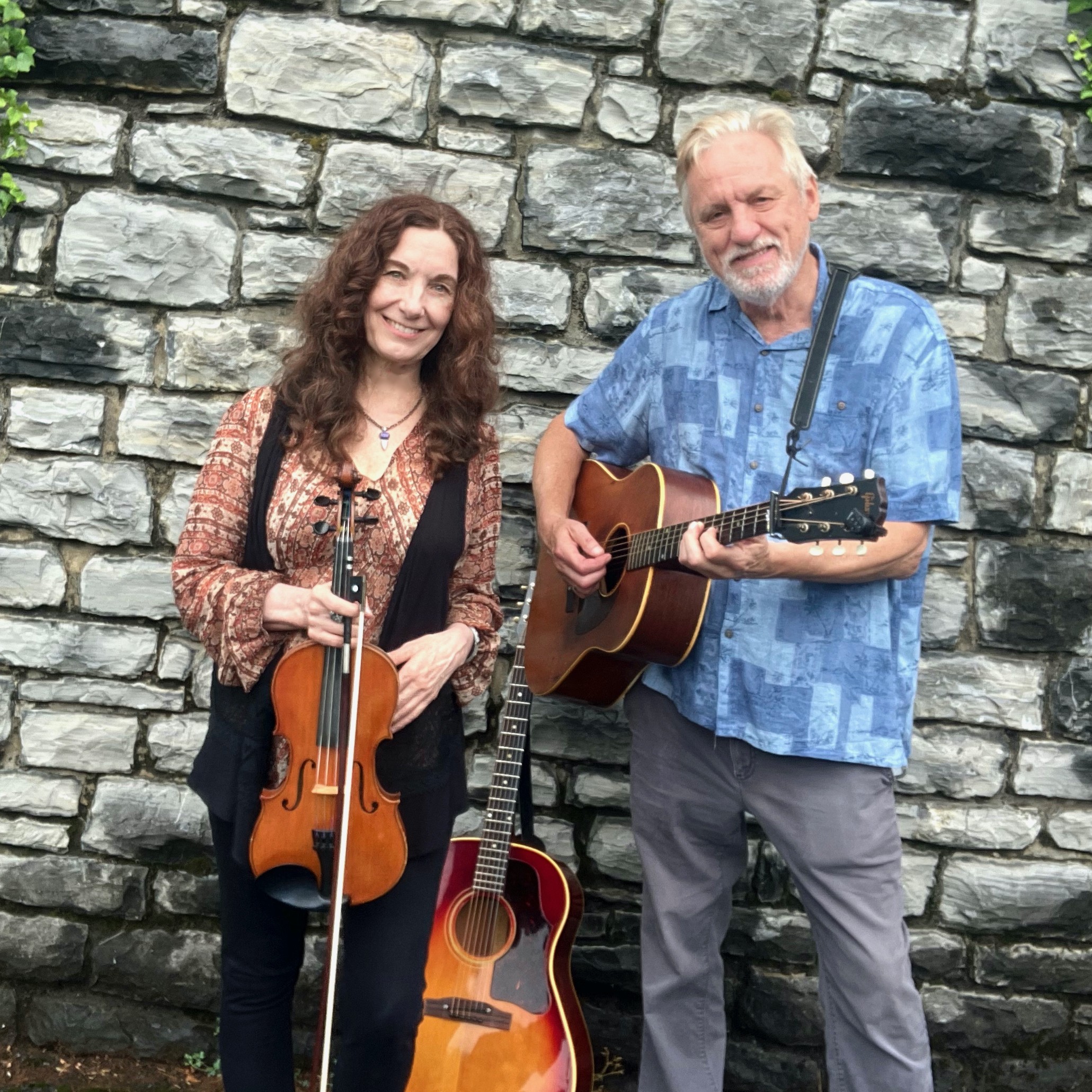 Photo of musicians Kate and Paul standing in front of a stone wall holding a violin and guitar.